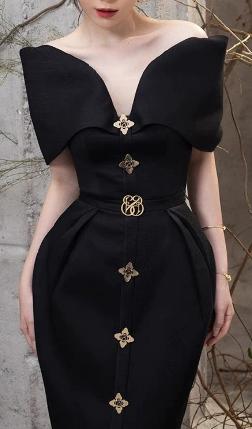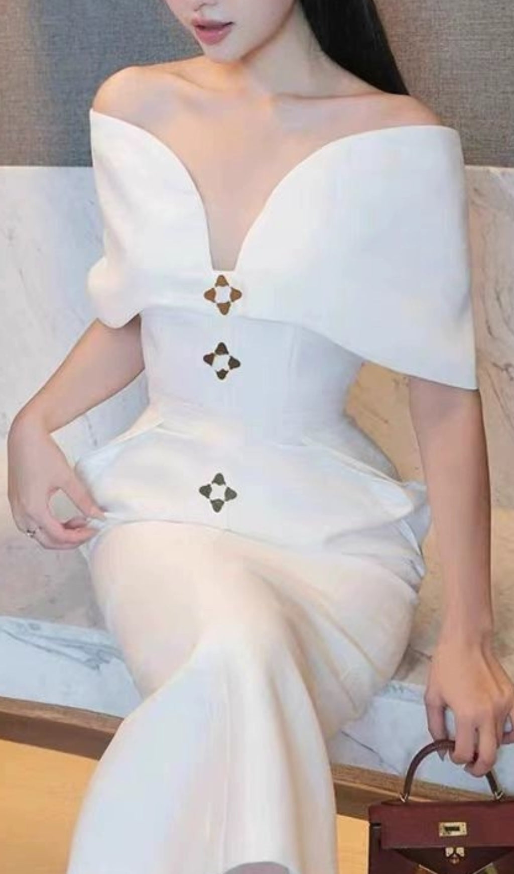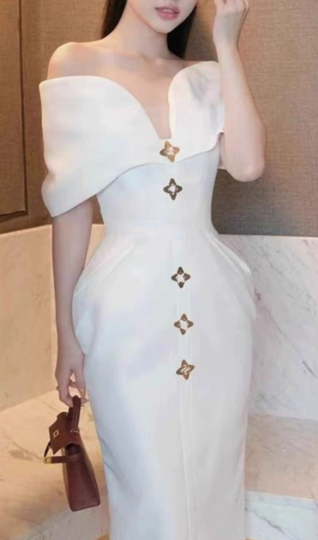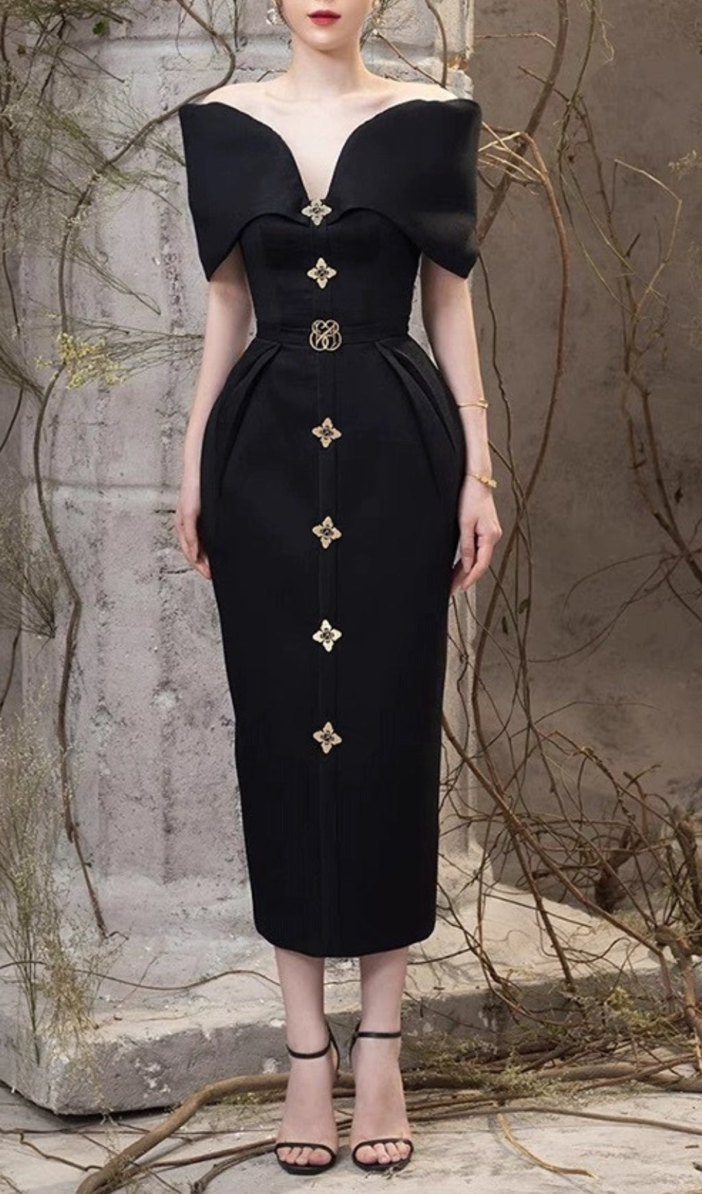 APOLINARY OFF-SHOULDER V-NECK MIDI DRESS