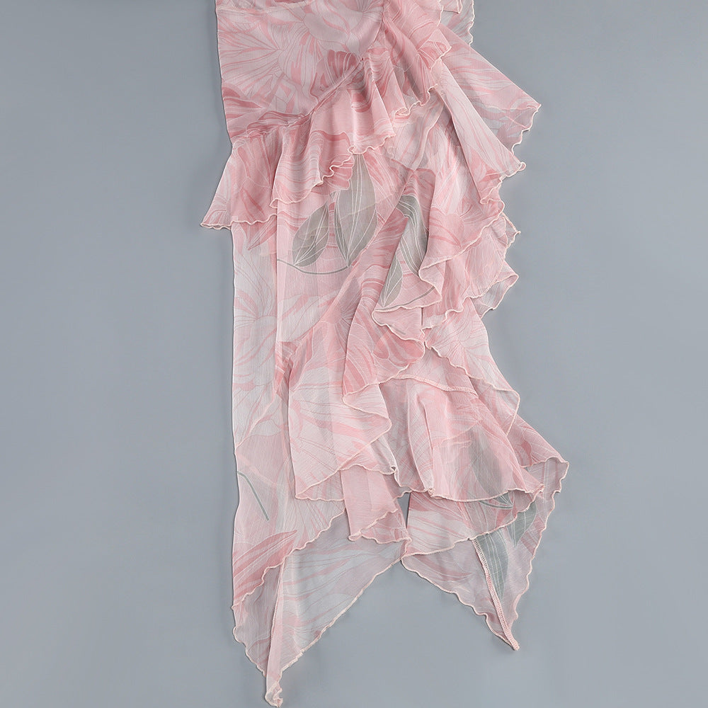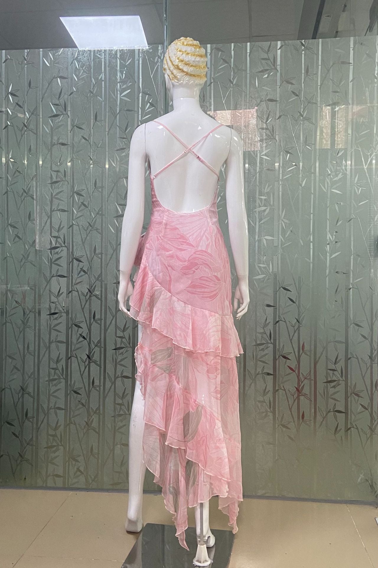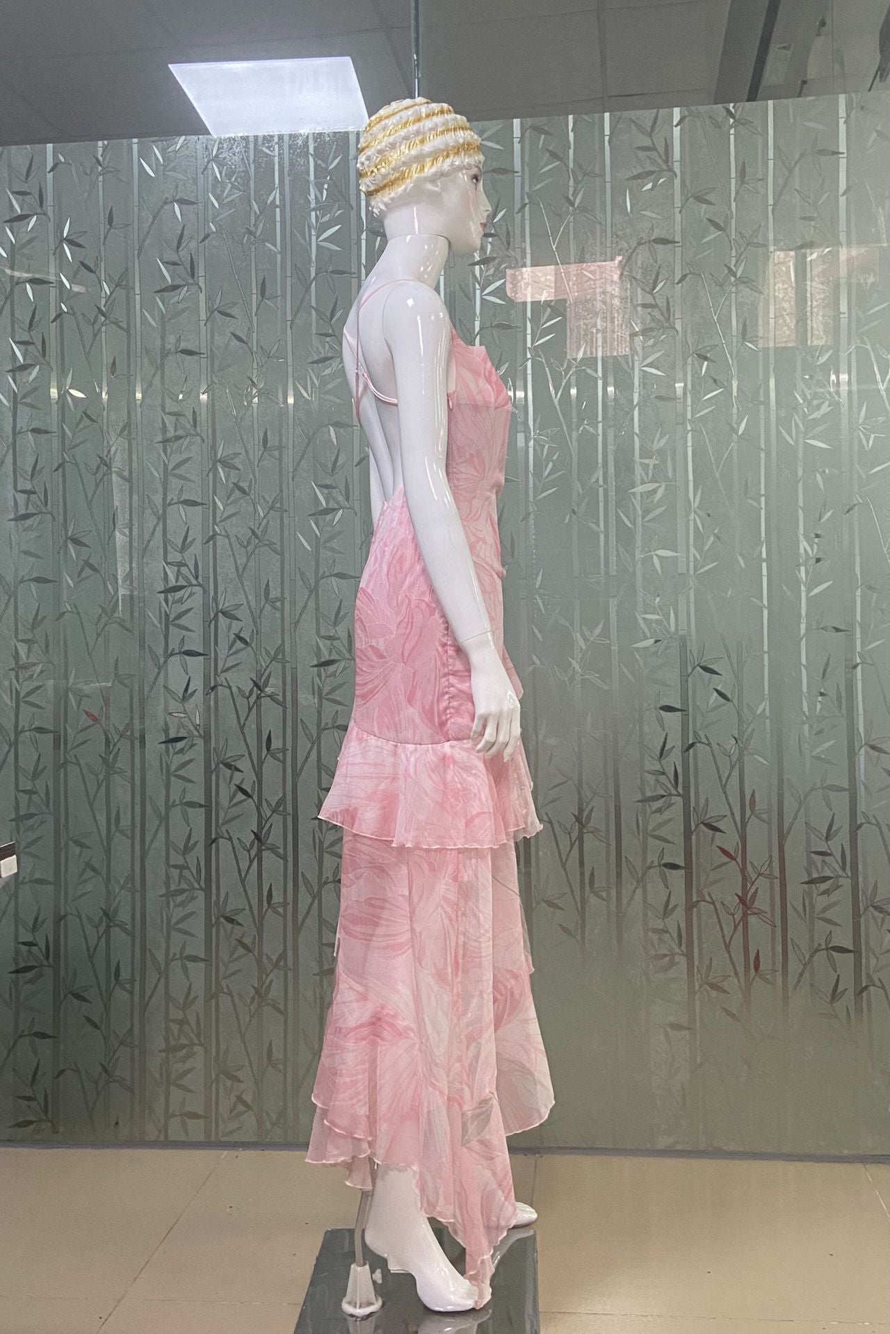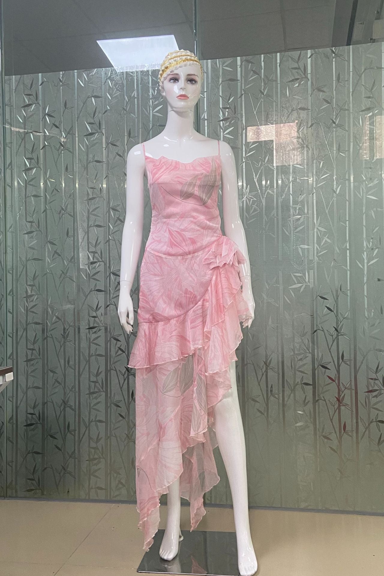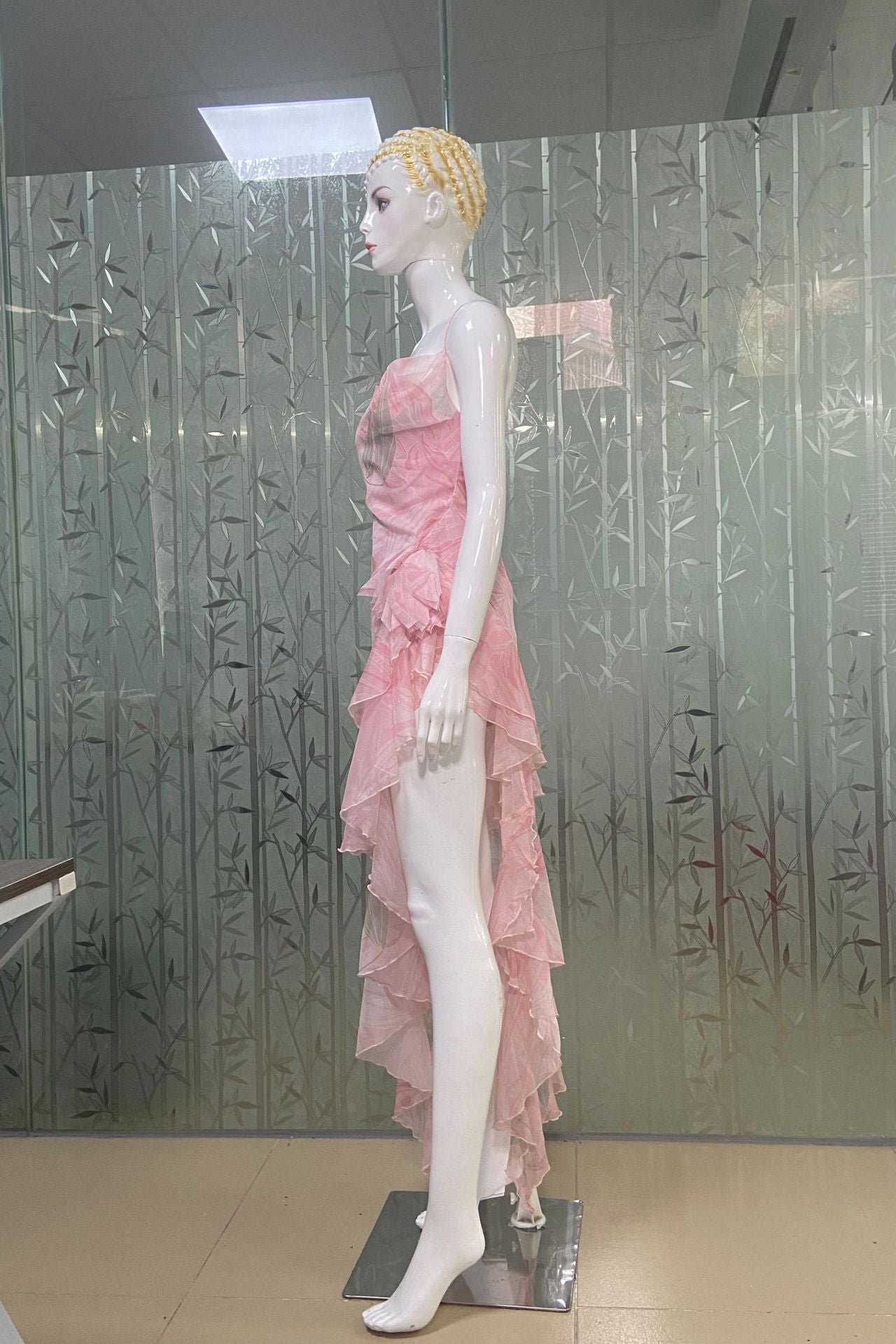 • Hemline: The irregular hemline features a high slit on one side and is adorned with multiple layers of ruffled frills. This imparts a dynamic and layered look, showcasing a unique charm as one walks. It also adds a lively and playful touch to the overall style.