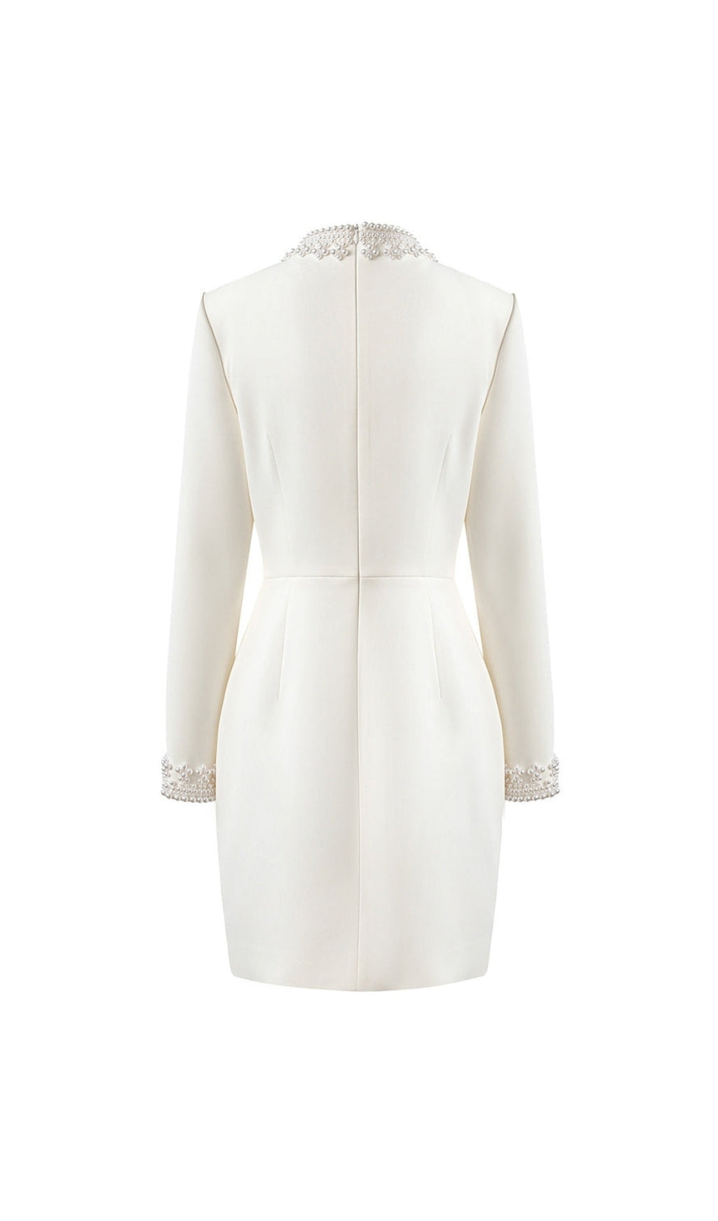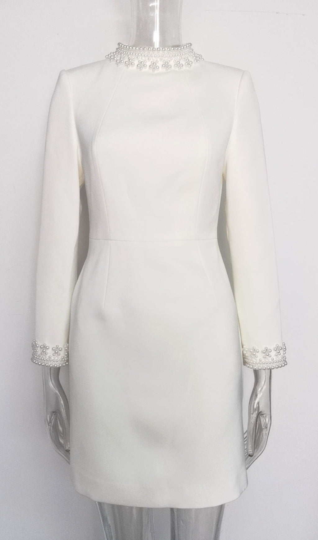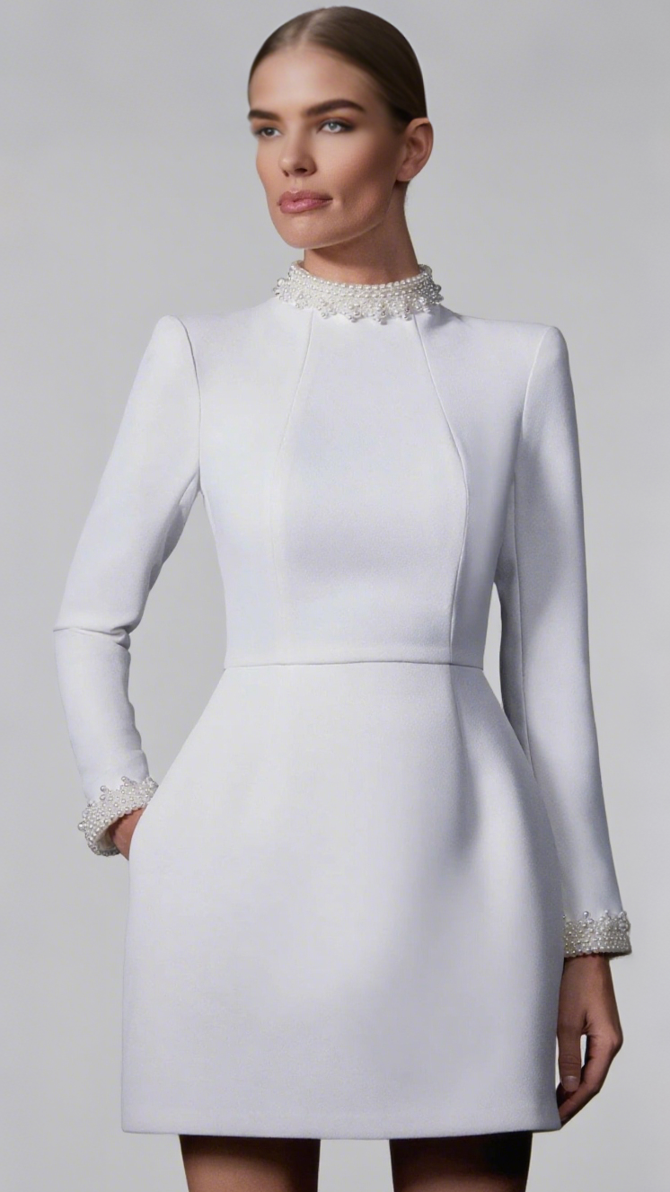 Elevate your wardrobe with this white long sleeve mini dress, featuring intricately beaded cuffs that add a refined touch of craftsmanship. The tailored silhouette ensures a flattering fit, while the mini length offers a modern, sophisticated edge. Perfect for formal events or stylish evenings, this dress combines elegance with subtle detailing to make a lasting impression.