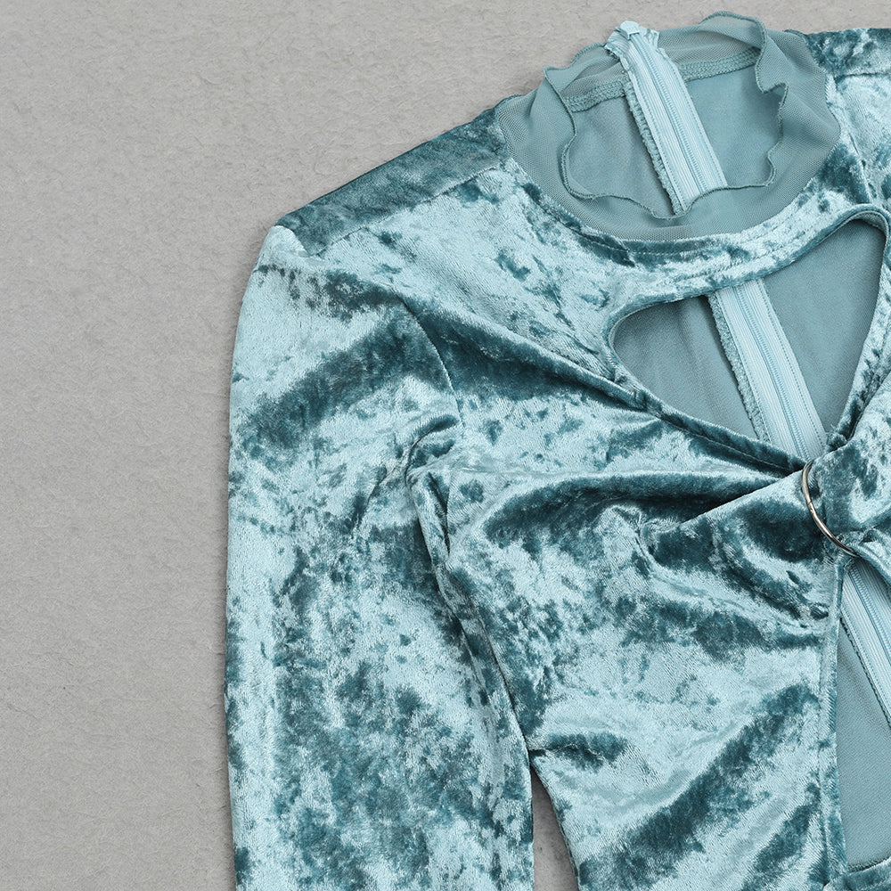 This luxurious dress is crafted from exquisite velvet of the highest quality, creating a look that is both sophisticated and timeless. The elegant long-sleeved design and towering high-hip cut flatter the figure and the delicate hollow details add a touch of glamour while keeping it simply chic. This dress is perfect for making a statement anywhere.