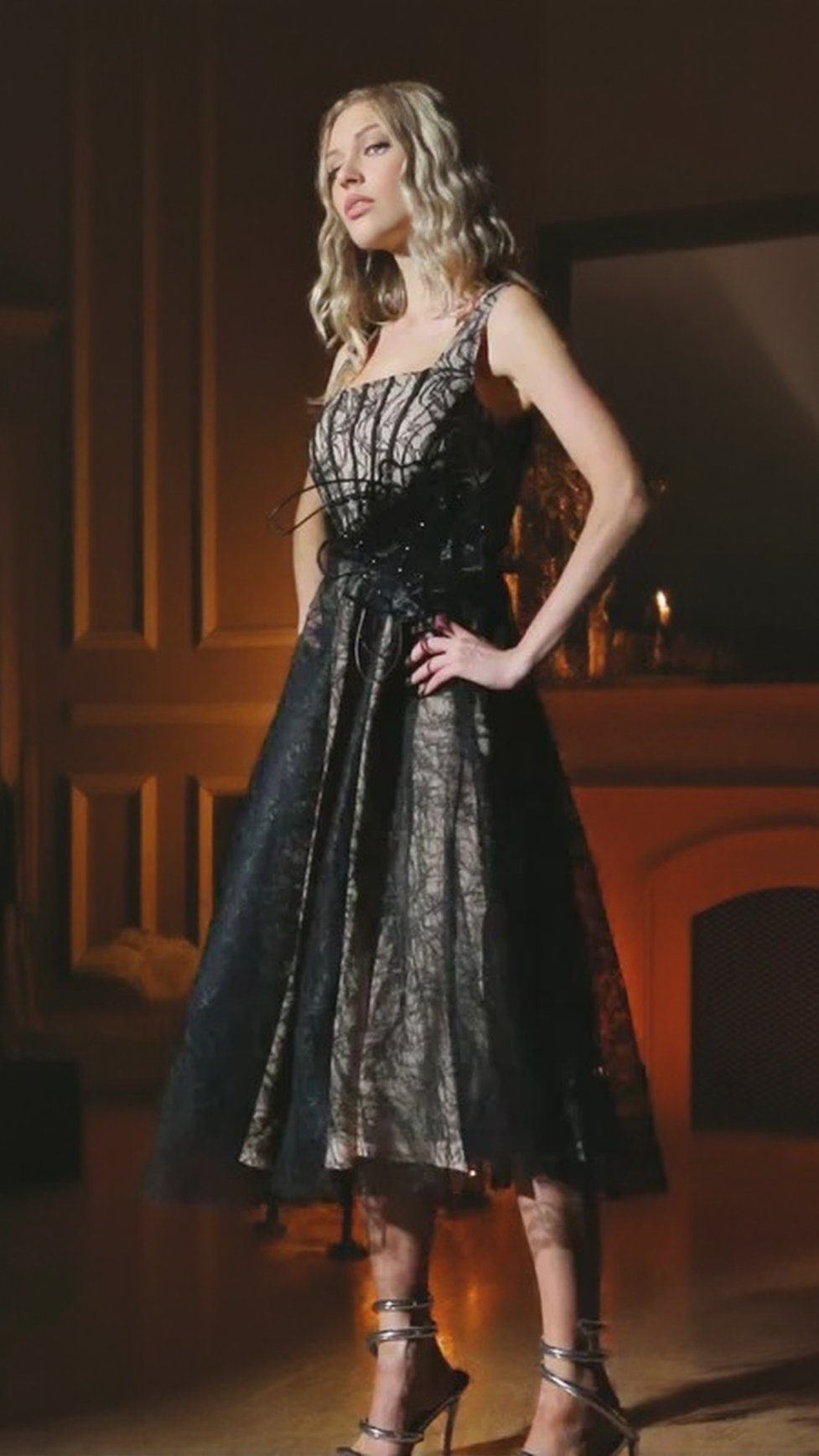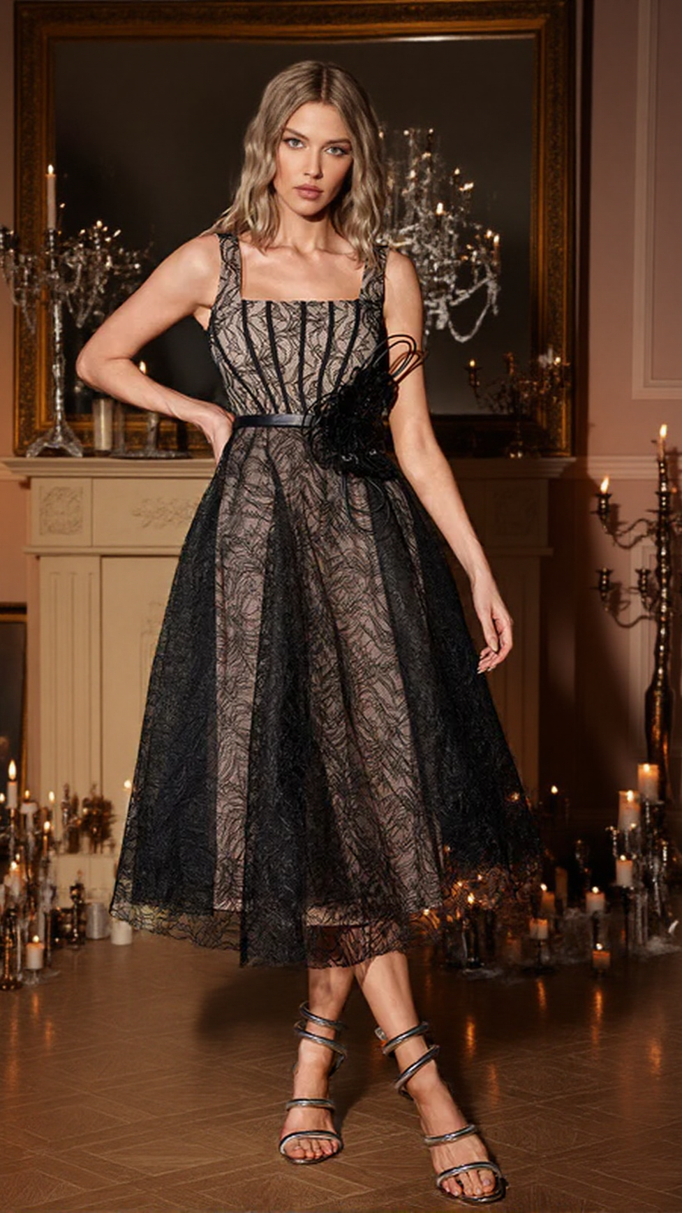 DORA 3D FLOWER SQUARE NECK LACE MIDI DRESS IN BLACK