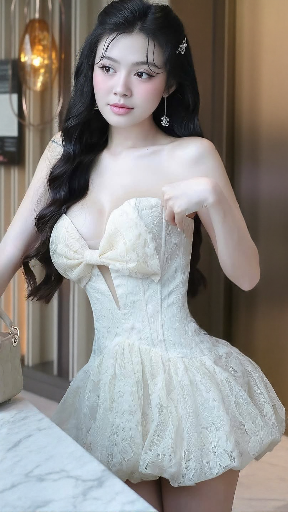 EMMA BOWKNOT HOLLOW TUBE TOP MINI DRESS IN BEIGE