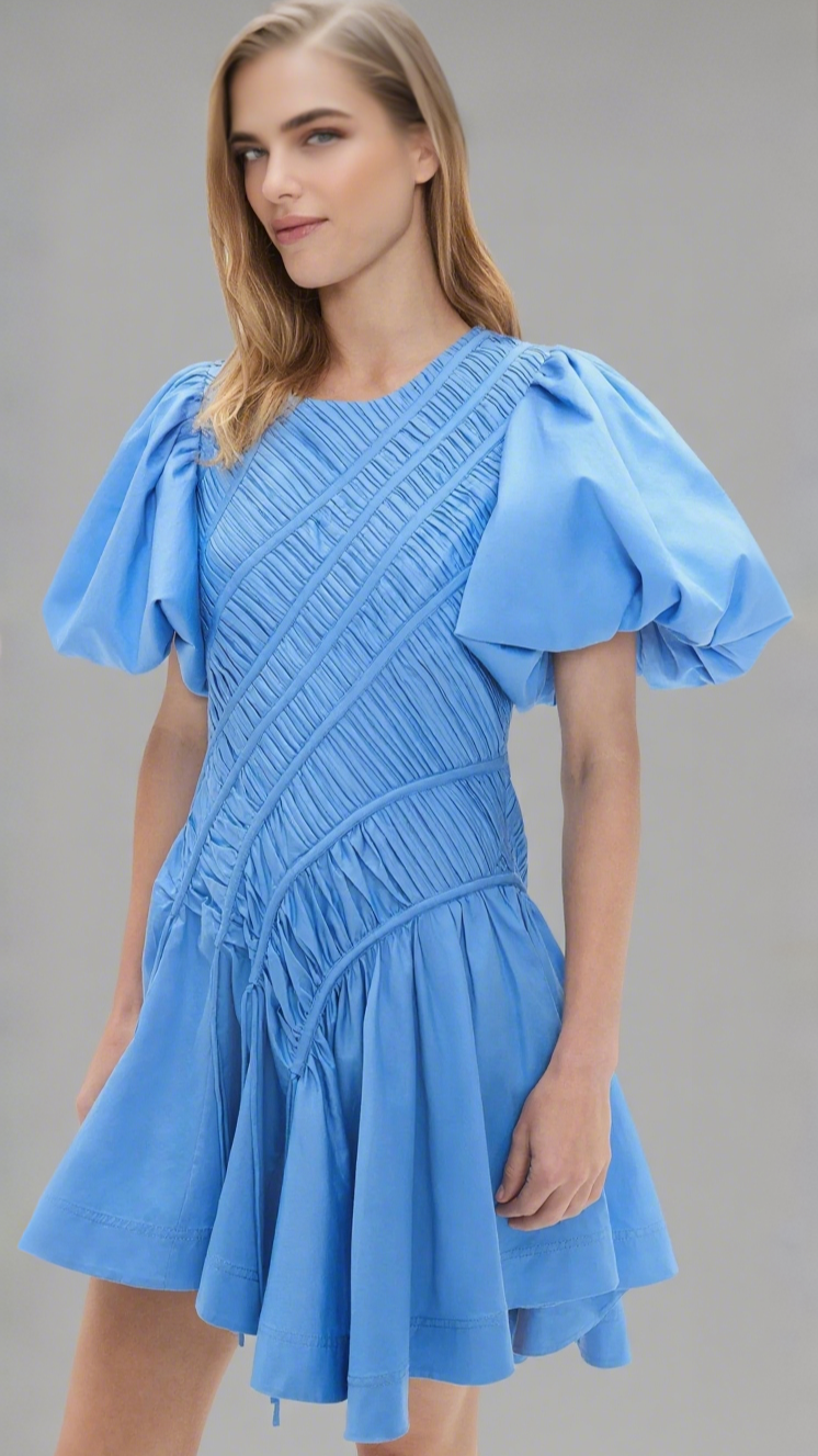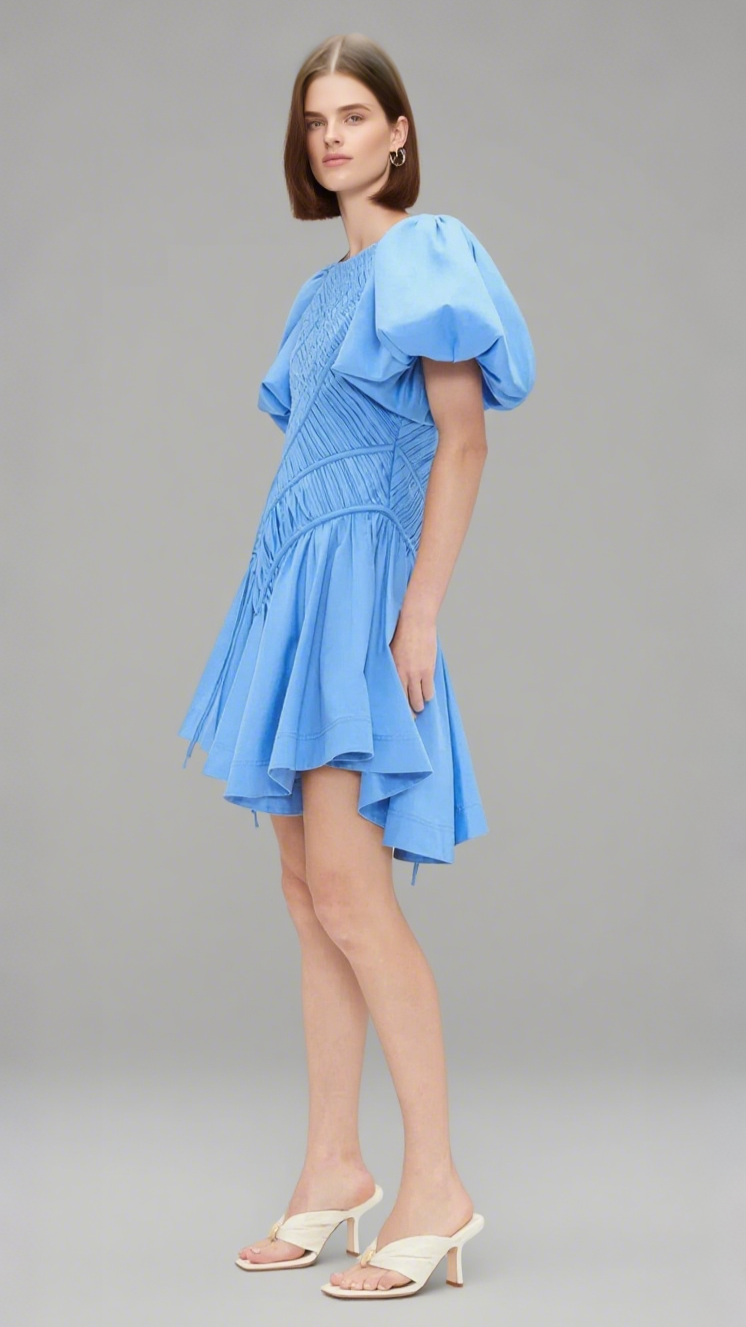EUDORA ASYMMETRIC PLEATED PUFF SLEEVE MINI DRESS IN MIST BLUE