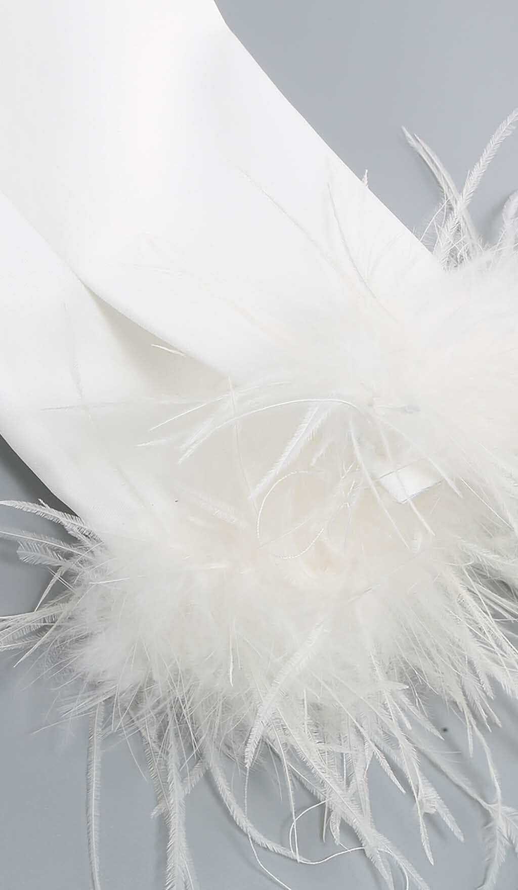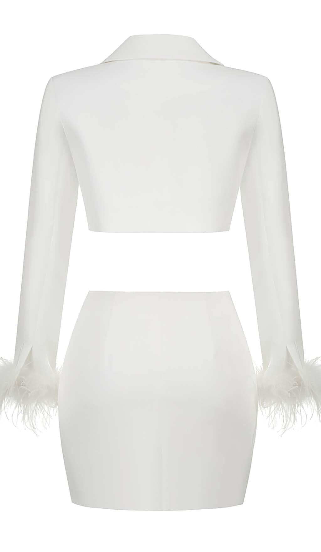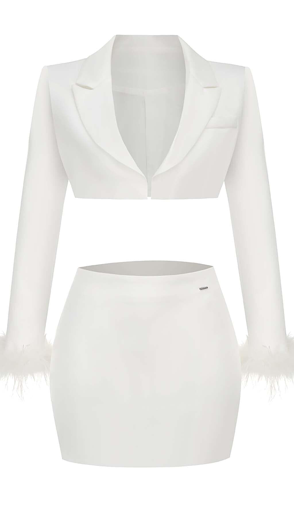 FEATHERS JACKET AND SHORT SKIRT IN WHITE