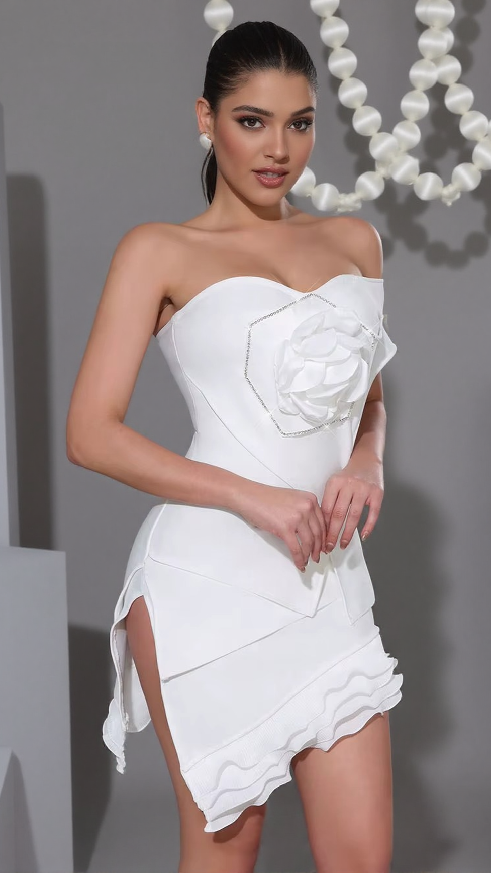 FLOWER DIAMOND RUFFLE TRIM TUBE TOP MINI DRESS IN WHITE