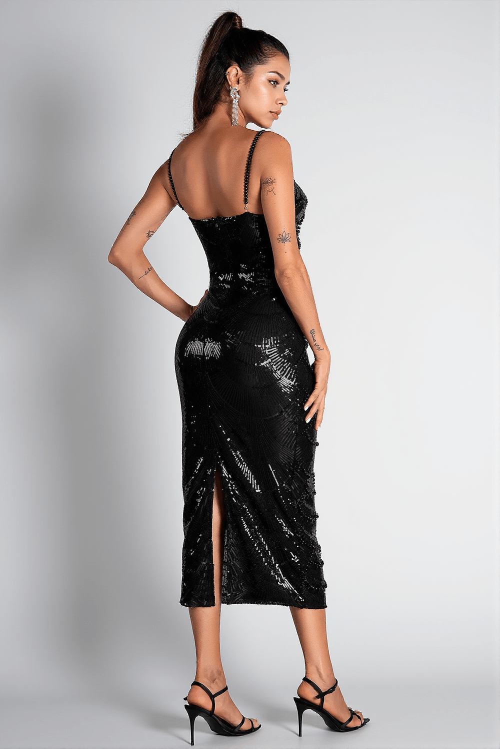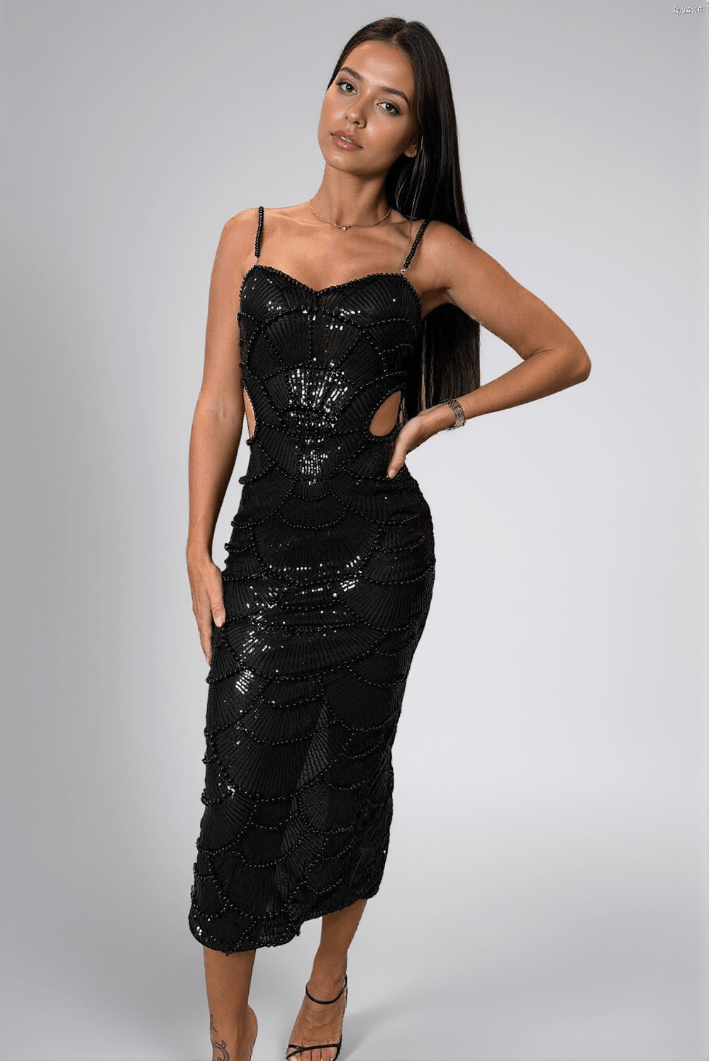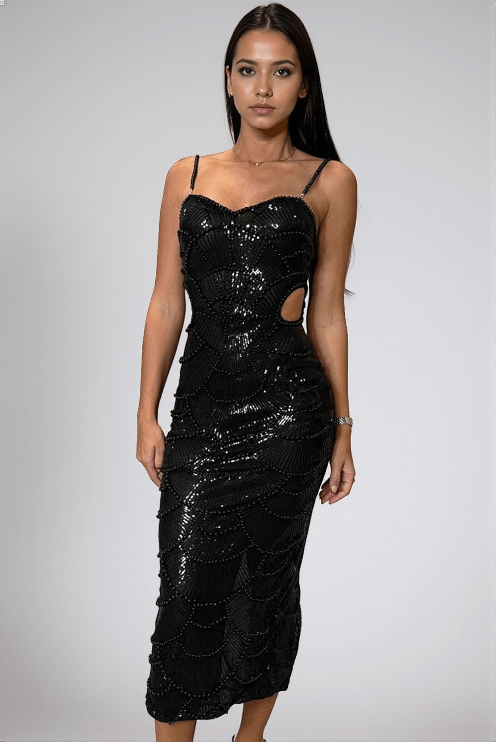 Experience the perfect blend of elegance and glamour with our Pearl Sequined Cut Out Midi Dress. This exquisite piece features dazzling pearl sequins that catch every light, coupled with chic cut-out details that add a daring touch to your look.