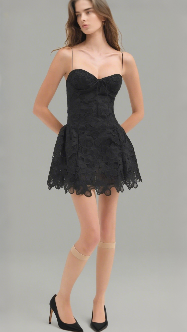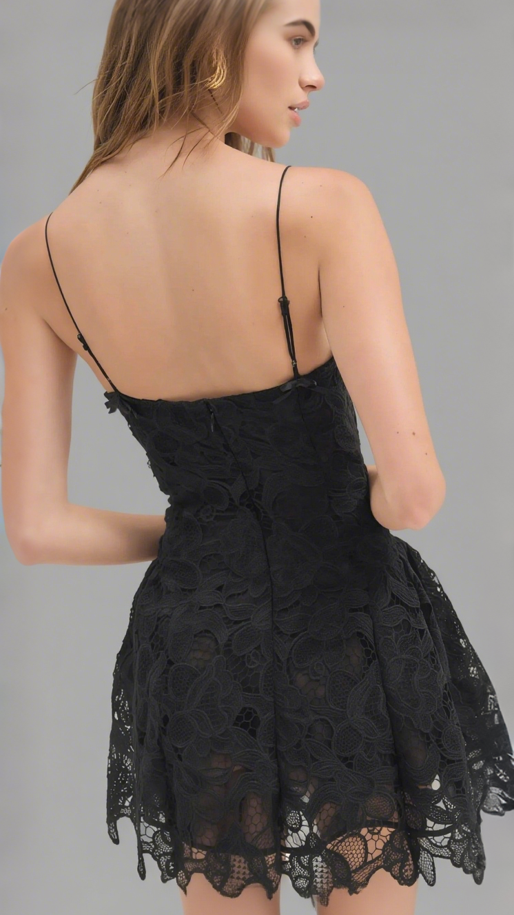 This black sleeveless mini dress features intricate lace with hollow detailing for a delicate, breathable design. Its fitted silhouette highlights your figure while the mini length adds a modern, confident edge. Perfect for evening events, it balances elegance with subtle allure.