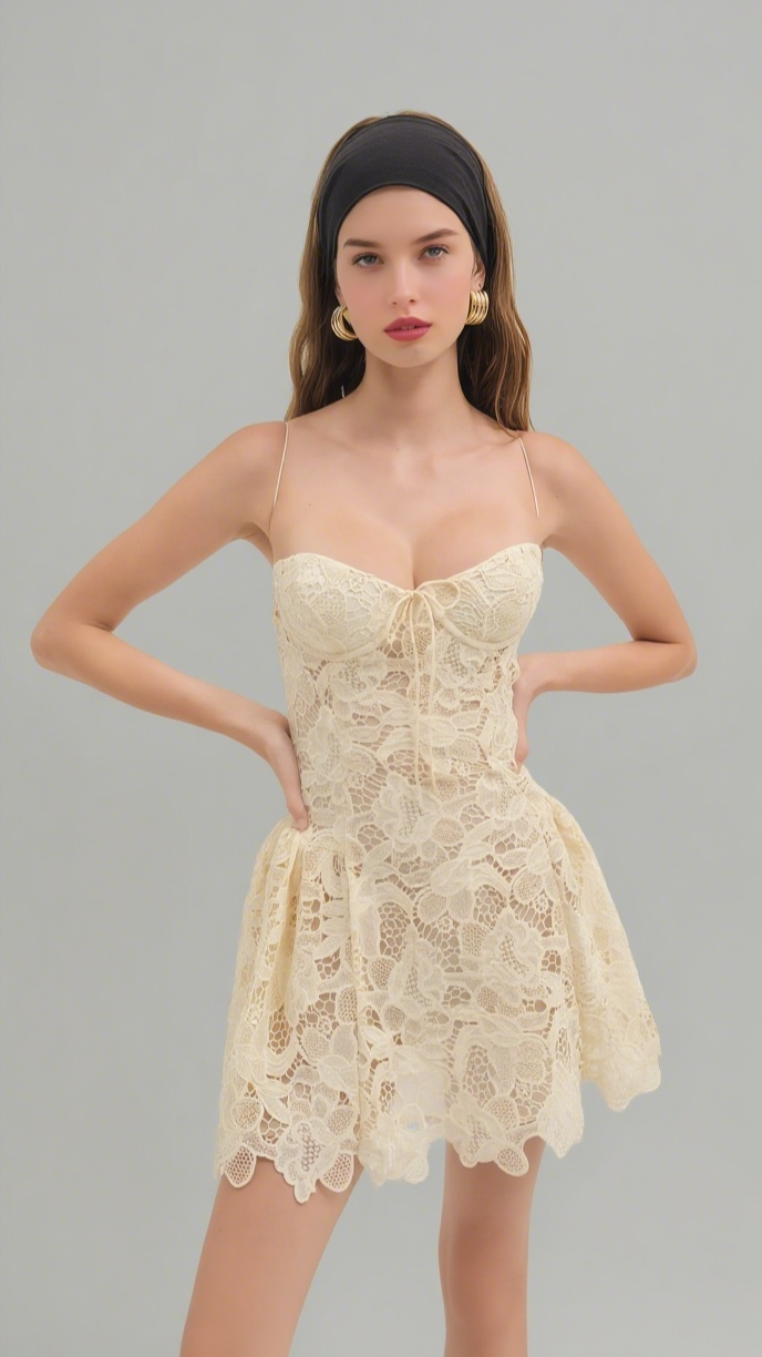 This yellow lace sleeveless mini dress features intricate hollow lace detailing that enhances breathability and visual appeal. Its fitted silhouette offers a flattering shape, making it an ideal choice for warm-weather occasions where style and comfort are key. The vibrant color adds a bold, fresh touch to any wardrobe, perfect for daytime or evening wear.