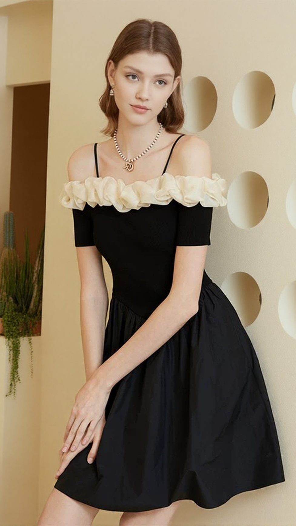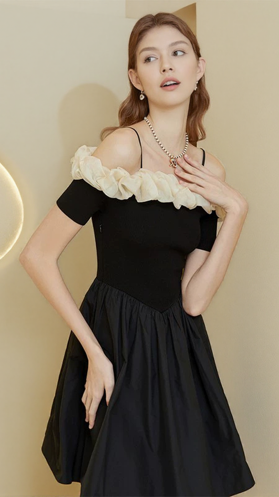 This black off-shoulder mini dress features delicate ruffle trim and adjustable suspender straps, offering a modern take on classic femininity. The off-shoulder neckline accentuates the shoulders gracefully, while the fitted mini length enhances your silhouette. Crafted for versatility, it transitions seamlessly from day to night, making it an essential piece for a refined, contemporary wardrobe.