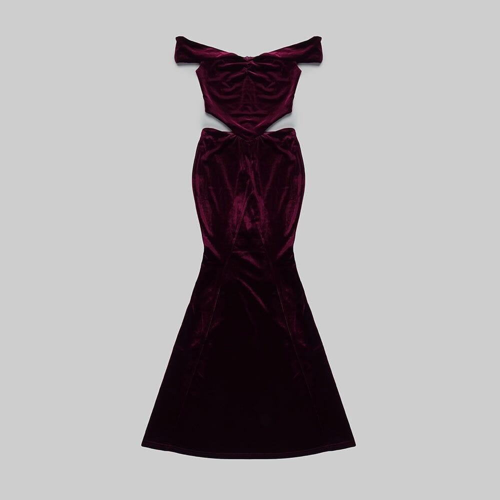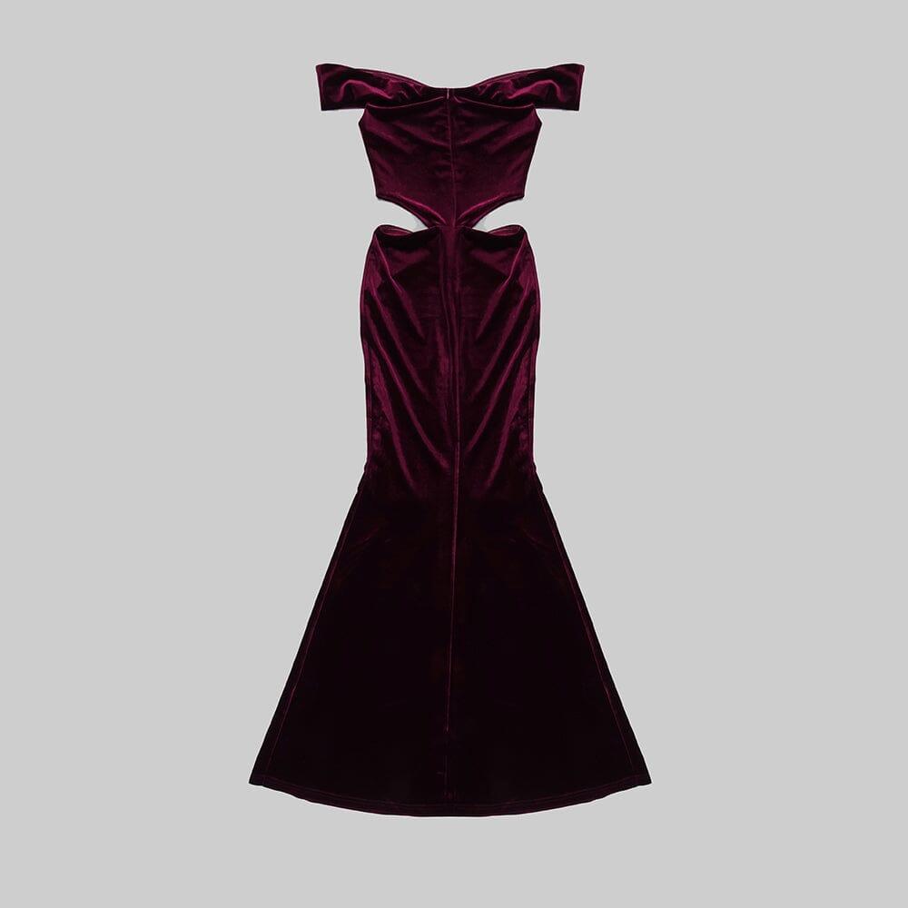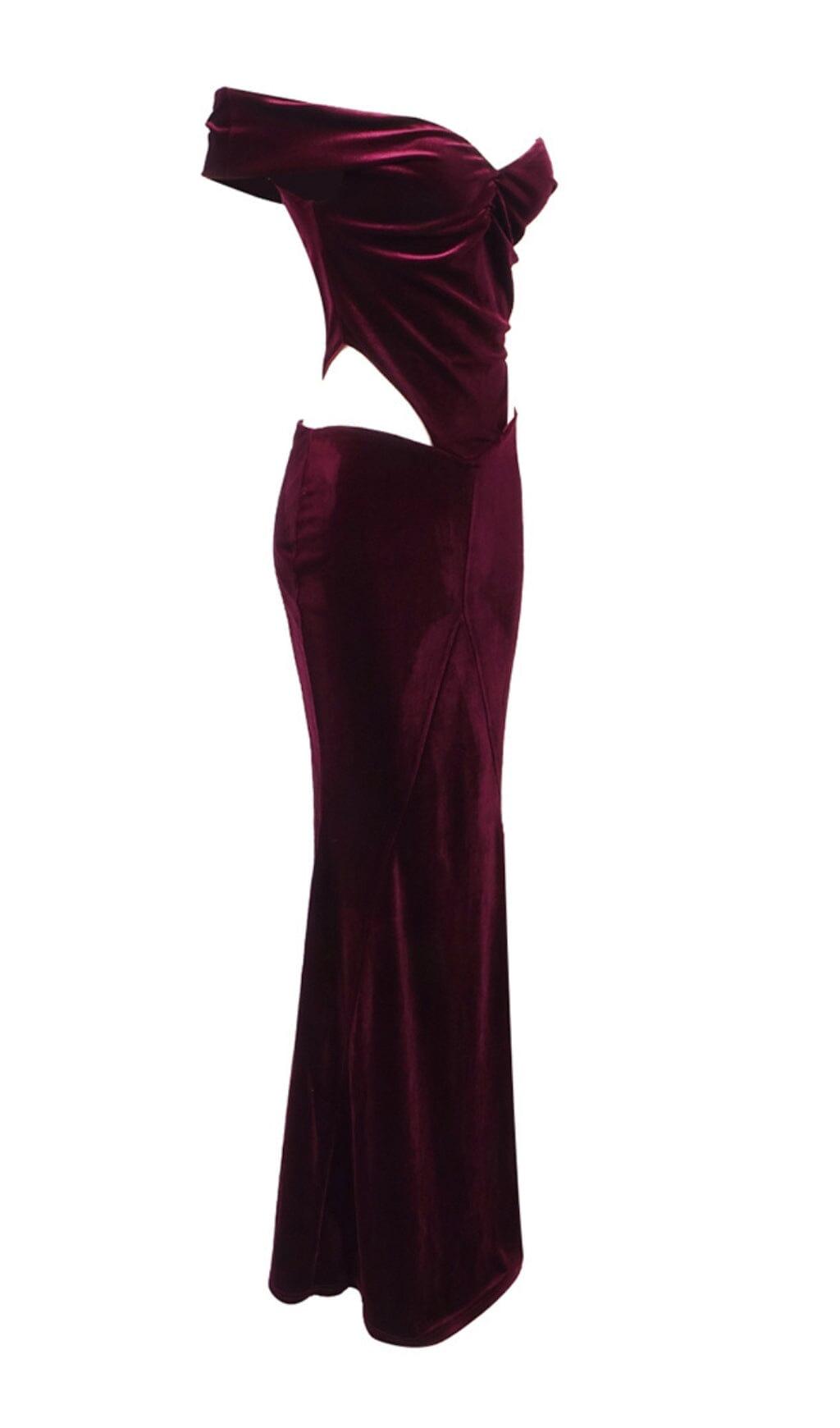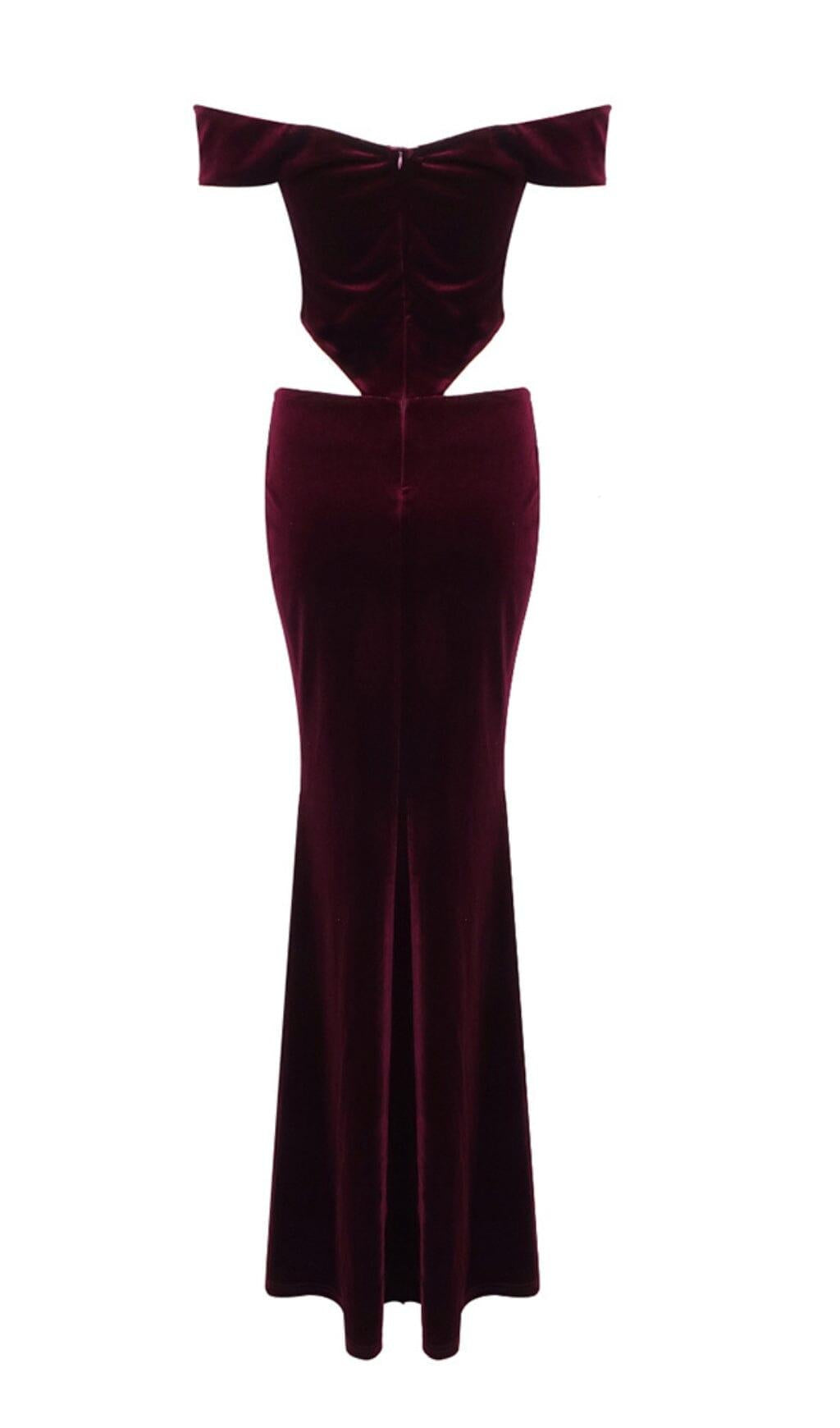 OFF SHOULDER WAIST HOLLOW VELVET MAXI DRESS IN BURGUNDY