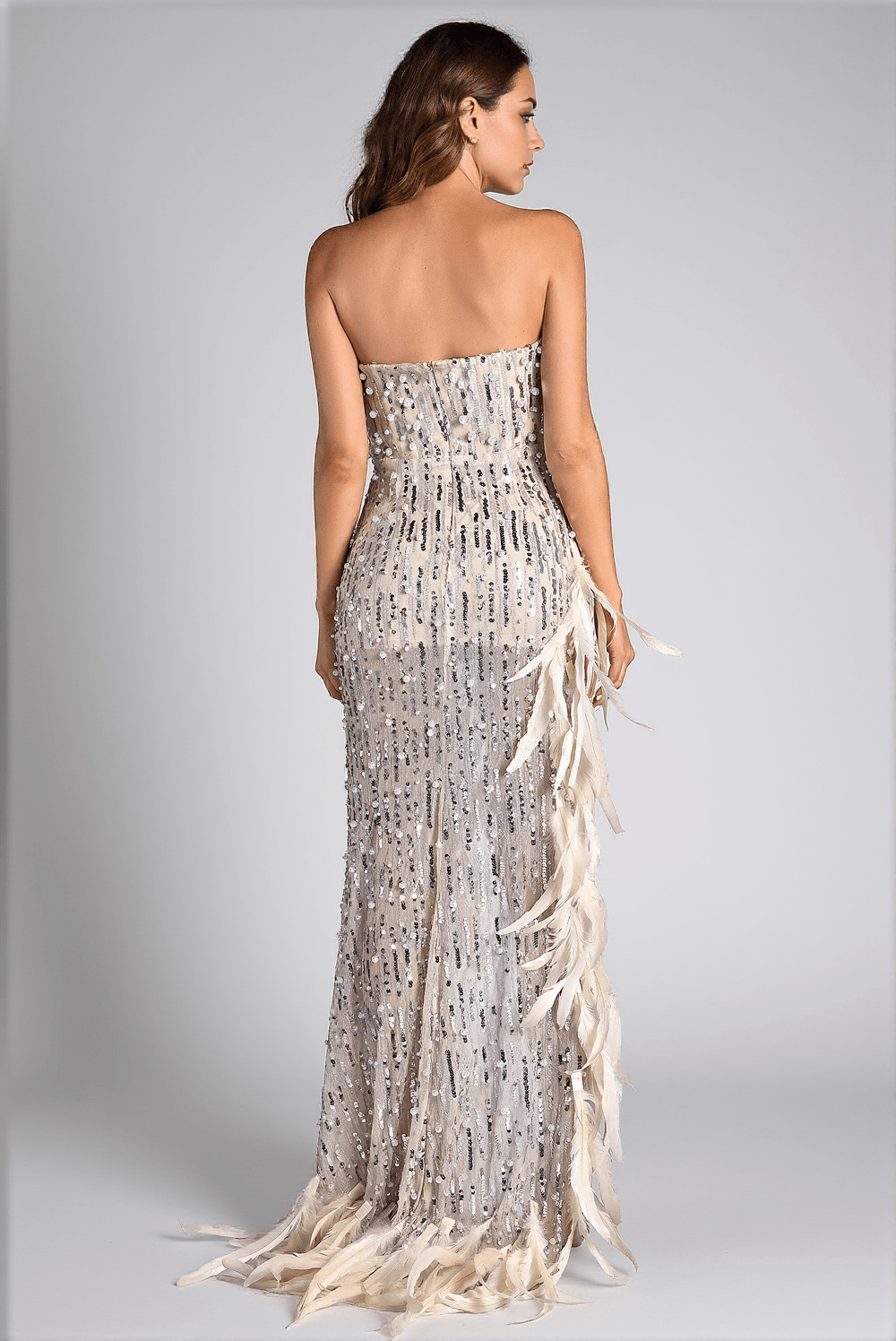 The Rematou Dress captivates with its mesmerizing blend of sequins and pearls, which shimmer elegantly as you move. Delicate feather accents along the slit add an ethereal touch, elevating your overall look to a new level of sophistication.