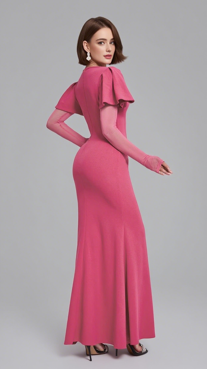 Ruffled Sleeve Mesh - Insert Mermaid Maxi Dress in Pink