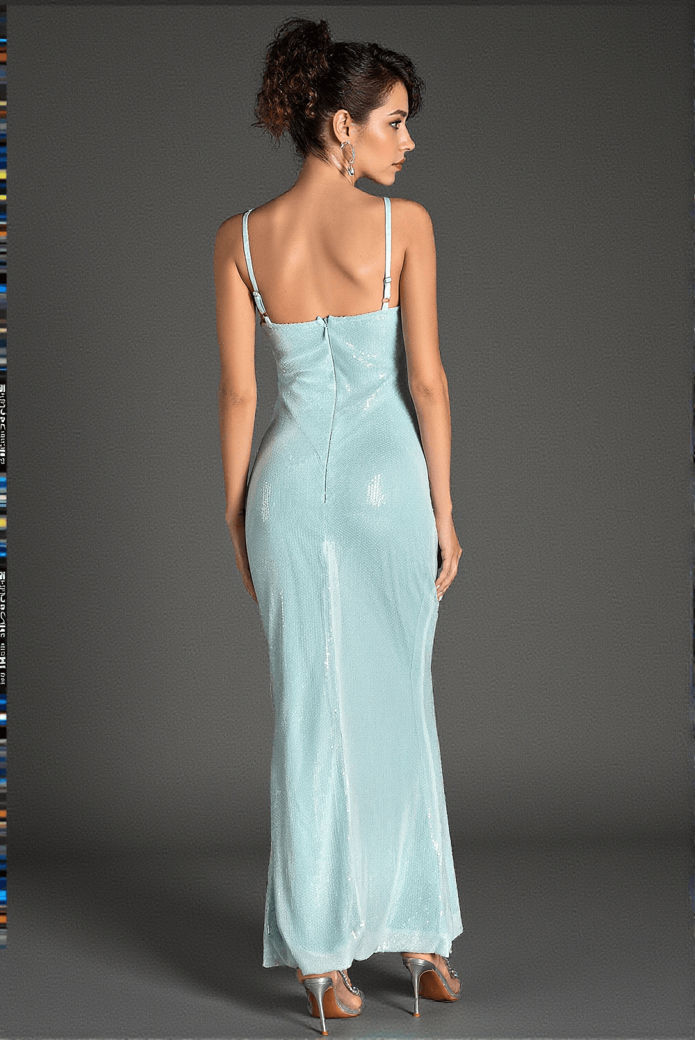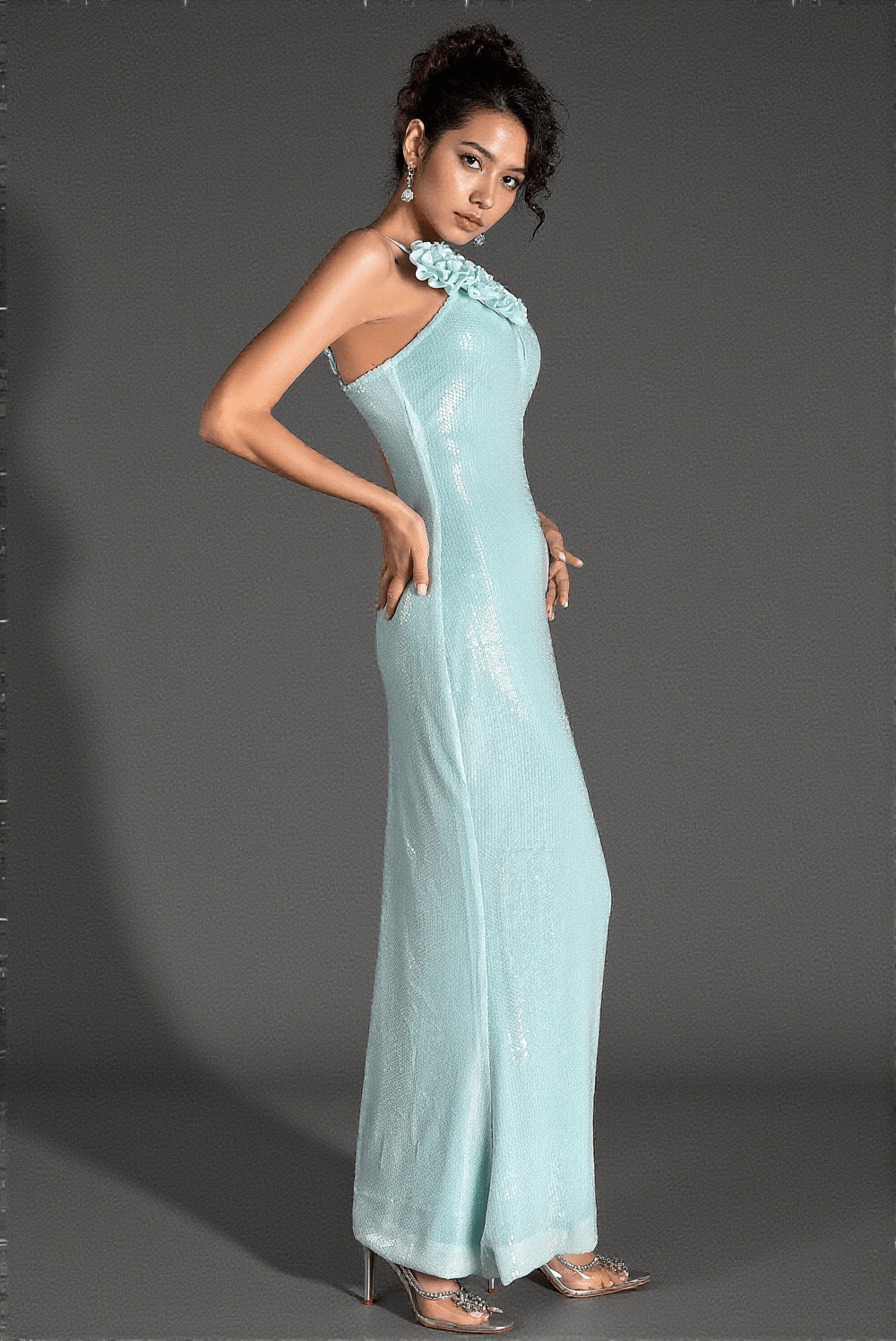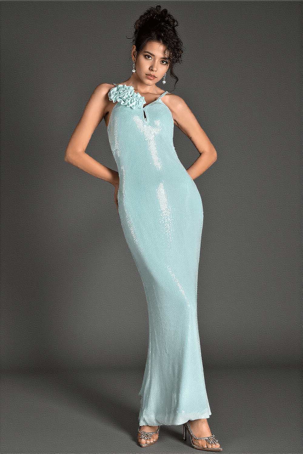 Accentuated with intricate flower embellishments on the delicate straps and shimmering sequin details throughout, this dress embodies a perfect blend of romance and glamour. Each step you take will sparkle under the lights.