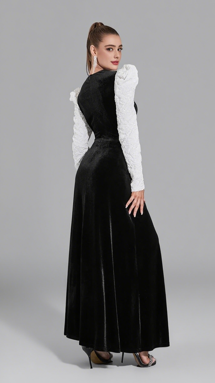 Velvet Puff - Sleeve Maxi Dress in Black And White